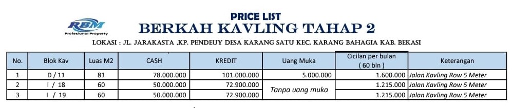 Untuk informasi mengenai hal ini bisa langsung cek harga tanah kavling bekasi, lengkap disitu tertera penjelasan mengenai harga tanah kavling terbaru yang ditawarkan oleh CV.Rahman Berkah Mandiri.
